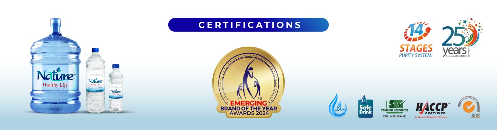 Every drop of Nature Water meets global safety and quality benchmarks — backed by internationally recognized certifications.